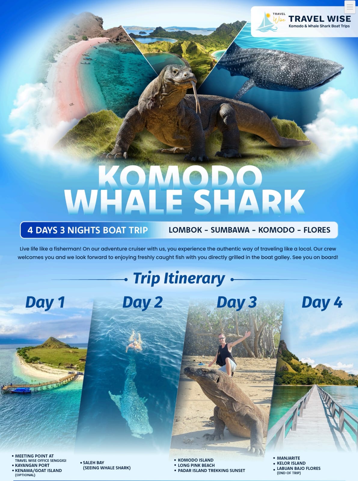 Boat komodo dari pulau lombok 4 hari 3 malam, juga melayani bali dari labuan bajo , berakhir tripnya di pulau lombok, tapi tripnya tidak mengunjung whale shark. jadwal keberangkatan nya setiap hari rabu & minggu